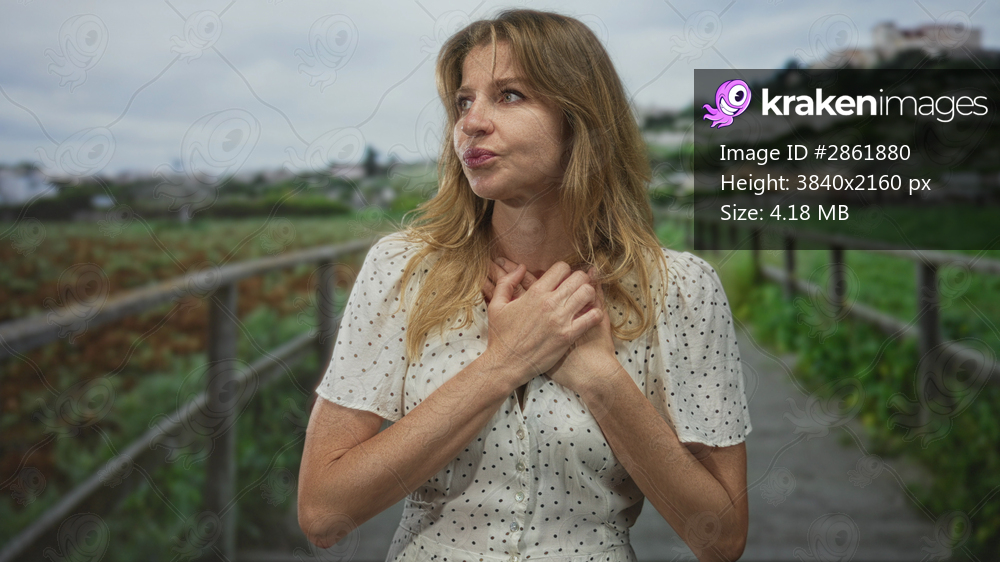 Woman clutch chest on street boardwalk in countryside with hands over chest and heartattack; anxiety healing.