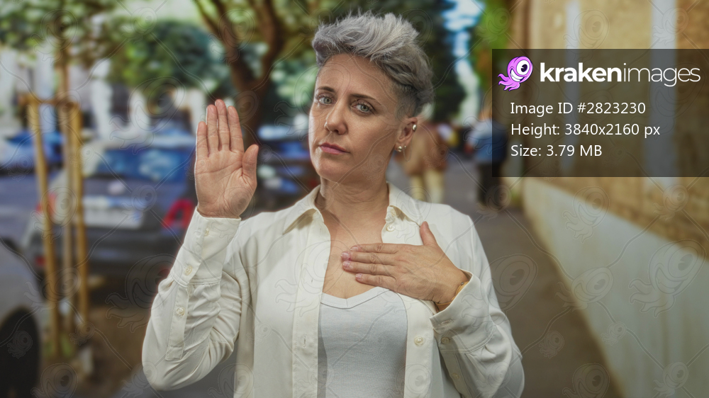 Woman clutch chest on street; pain distress.