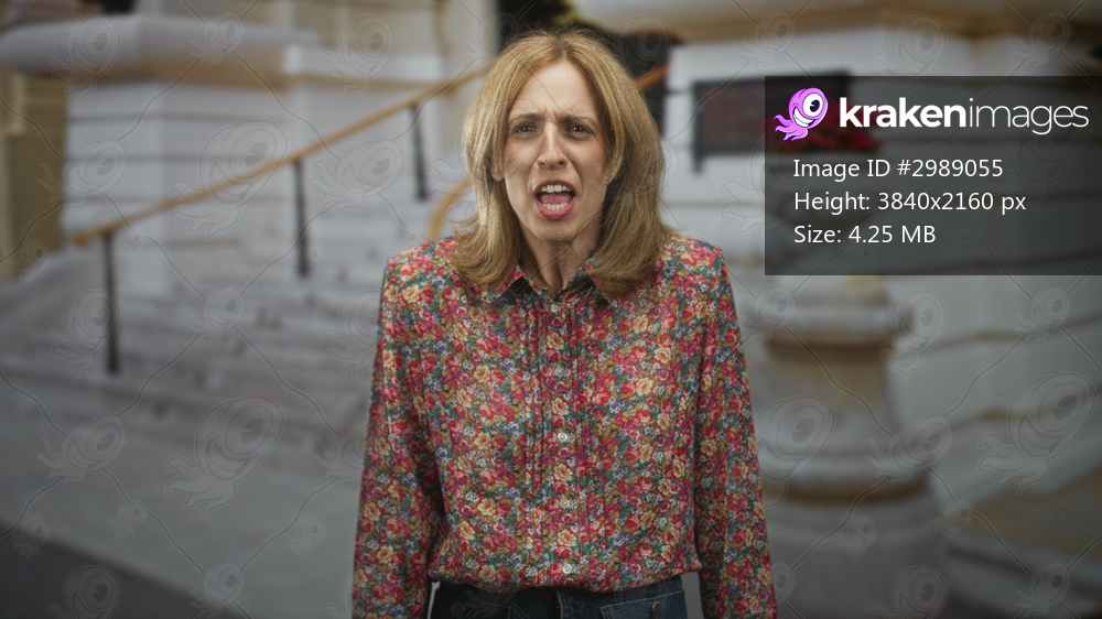 Woman clutches blouse with hands and mouth open in front of building stairs and planter; emotional release frustration.
