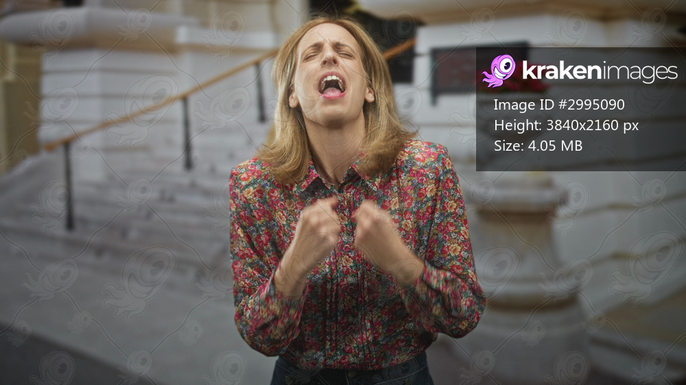 Woman clutches blouse with hands and mouth open in front of building stairs and planter; emotional release frustration.