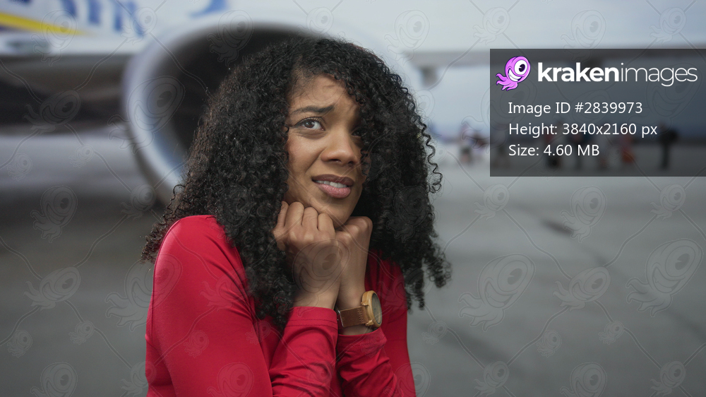Woman clutches fists under chin in front of large jet engine at a busy outdoor airport terminal; anxiety.