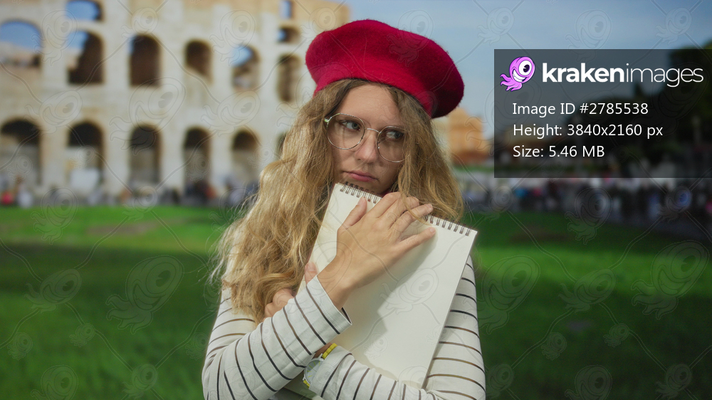 Woman clutches notebook close to chest, hugging it gently against a rome backdrop, accentuating blonde locks and revealing a pensive tourist adorned in beret during travel at iconic landmark. - Kraken Images