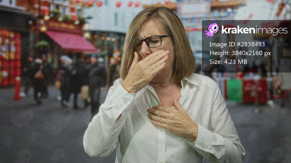 Woman clutches throat in busy urban street scene by storefront wearing white shirt amidst blurred crowd; panic and urgency.