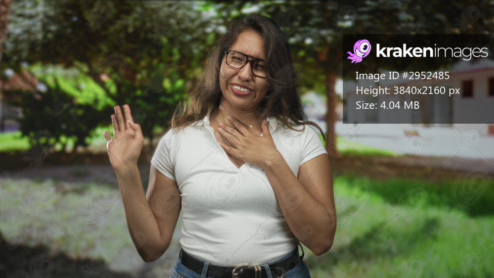 Woman clutching chest as if heartattack in forest with glasses and white shirt, reaching and smiling toward camera; relief.