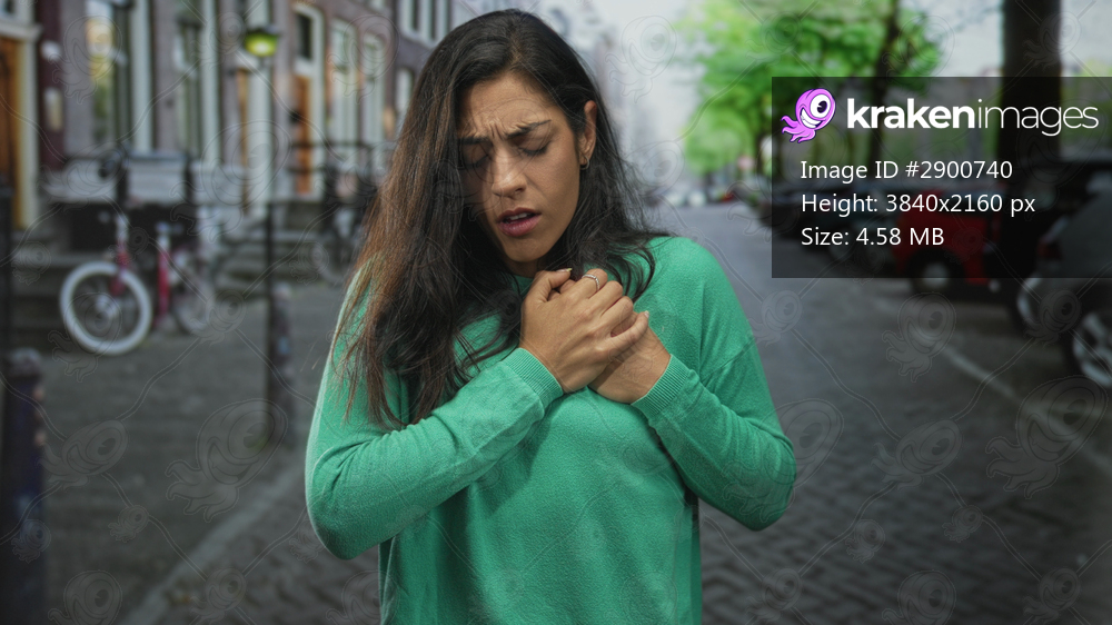 Woman clutching chest with both hands on city street near parked cars and bikes in green sweater; distress.