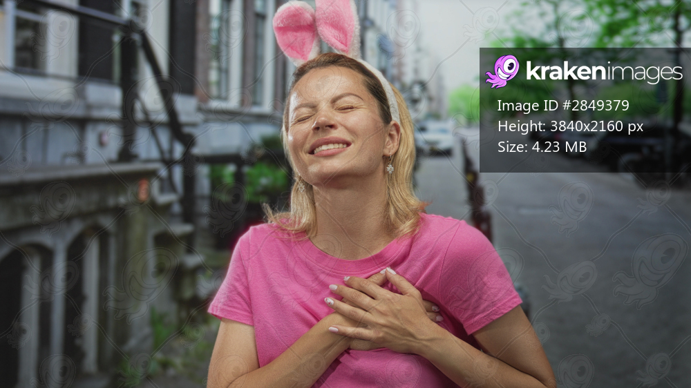 Woman clutching chest with both hands on city street while wearing pink bunny ears and a matching shirt; distress discomfort.