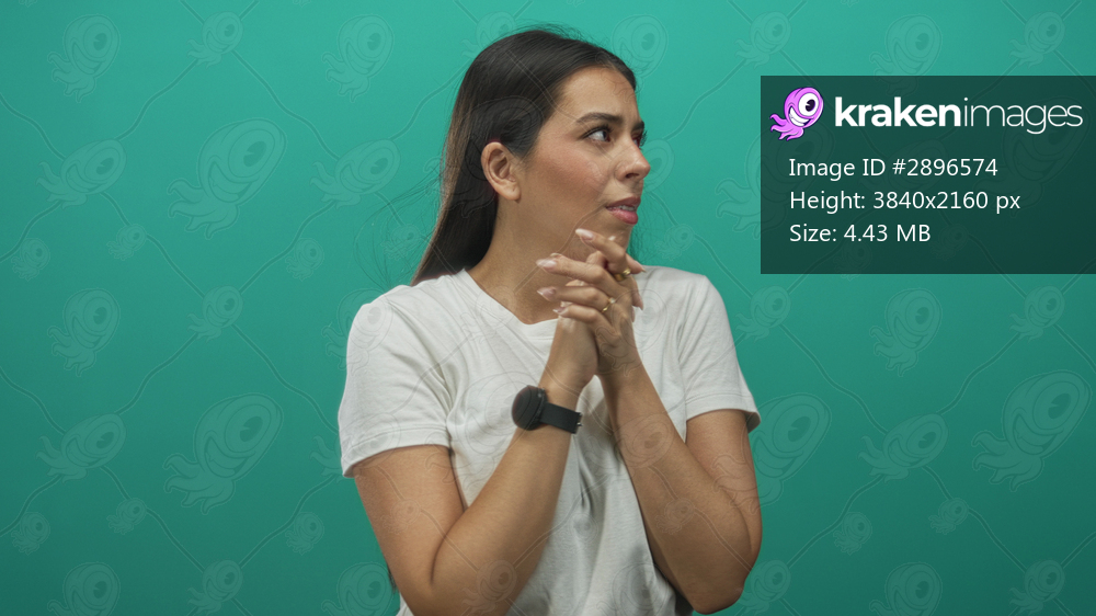 Woman clutching chest and clasping hands while looking to the side, wearing a white t shirt and watch in a teal green studio, hands on chest suggesting chest pain; anxiety. - Kraken Images