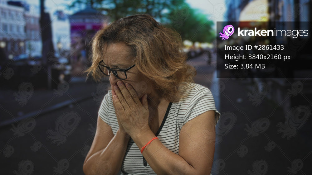 Woman clutching chest and covering mouth while standing on an empty urban street lined with lights at dusk; panic.