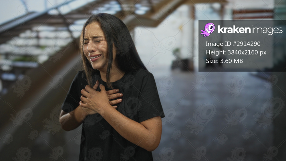 Woman clutching chest with hands near sternum by indoor staircase in modern building, eyes closed and tearful expression; emotional distress.