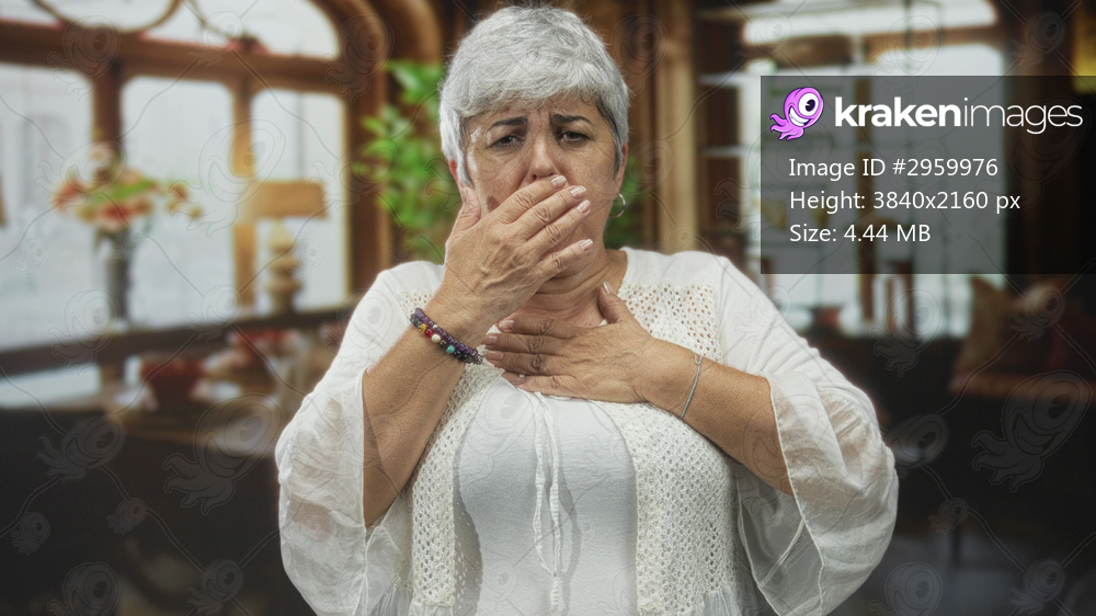Woman clutching chest and pressing throat with both hands in a sunlit building living room, eyes closed and pained expression; distress.