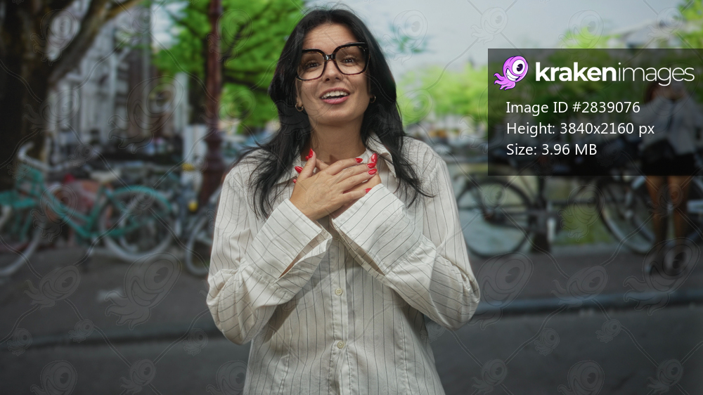 Woman clutching chest and smiling beside parked bicycles by a city canal outdoors wearing glasses and striped shirt; gratitude.