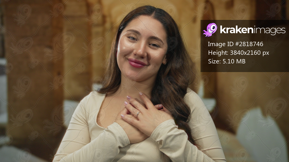 Woman clutching chest and smiling gently in front of an old stone university building outdoors under golden sunlight; gratitude.