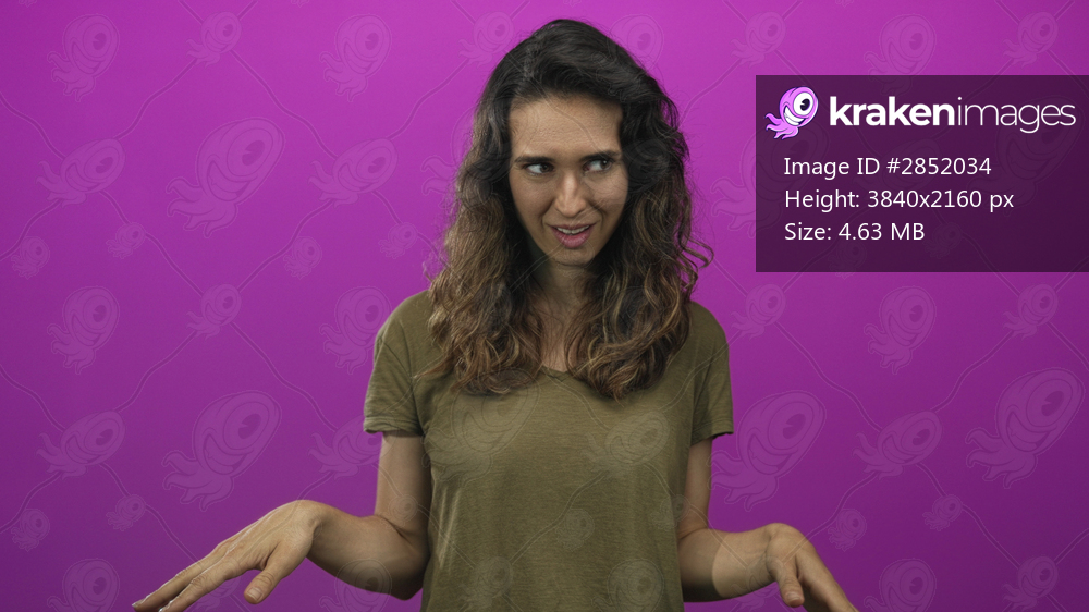 Woman clutching chest wearing olive shirt and glancing sideways with tousled hair in purple studio; skepticism.