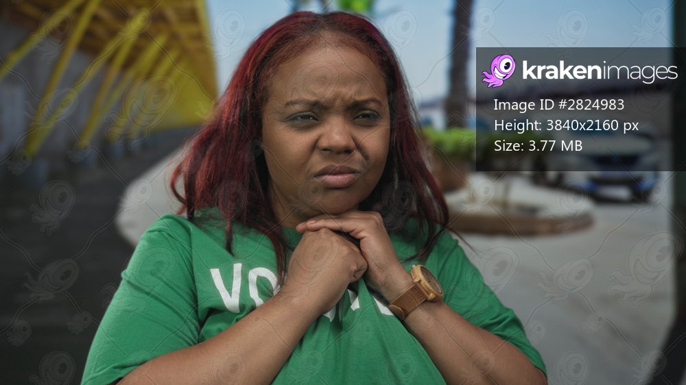 Woman clutching collar of green volunteer shirt with tense hands and glancing sideways on street; anxiety.