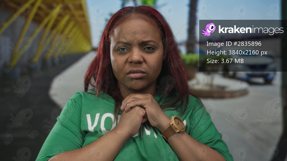 Woman clutching collar of green volunteer shirt with tense hands and glancing sideways on street; anxiety.