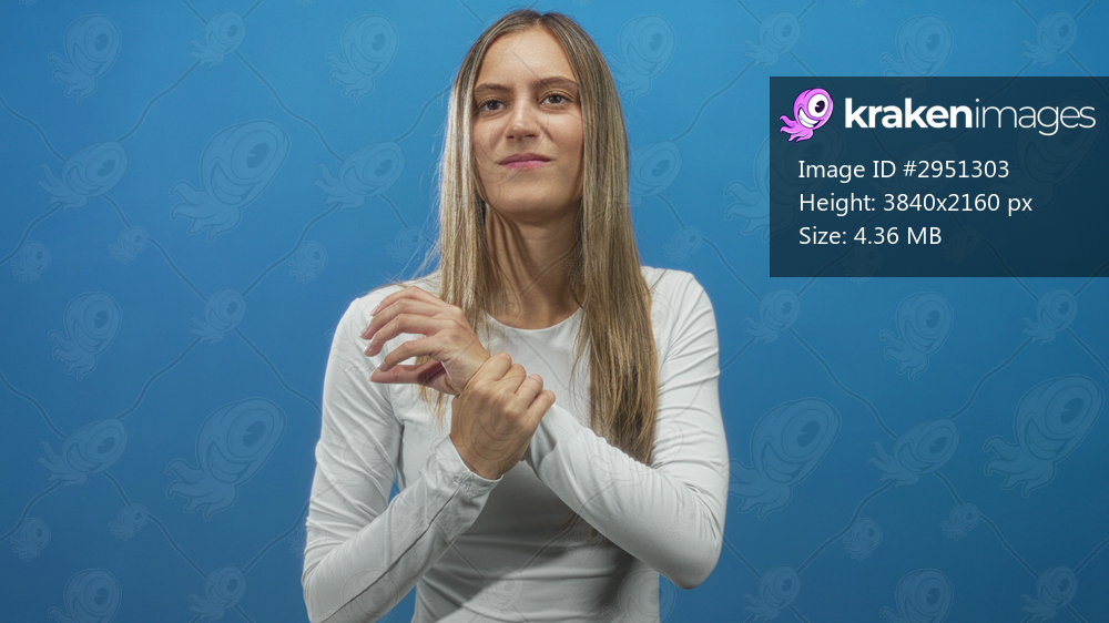 Woman clutching her bare wrist with both hands in a blue studio while wearing a white long sleeve top; discomfort recovery.