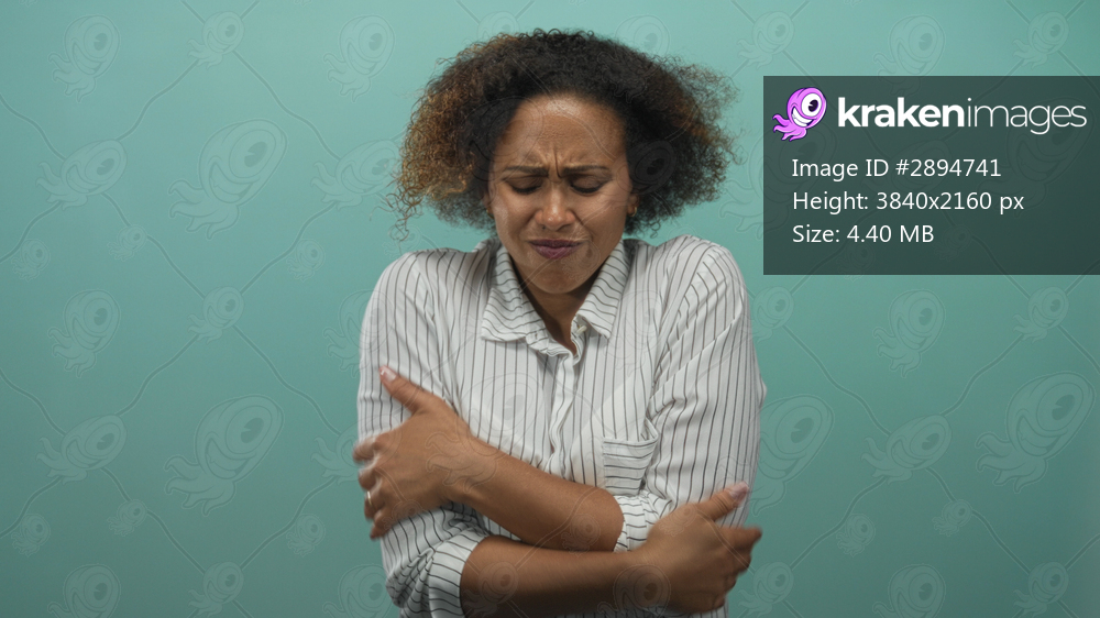 Woman clutching her shoulders and rubbing her hands while shivering against a teal studio backdrop; discomfort.