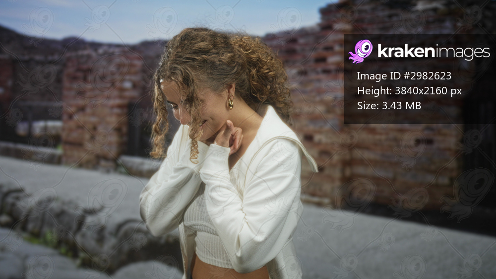Woman clutching hoodie at throat, smiling with head tipped back in front of ancient building on a sunlit outdoor walkway; joy.