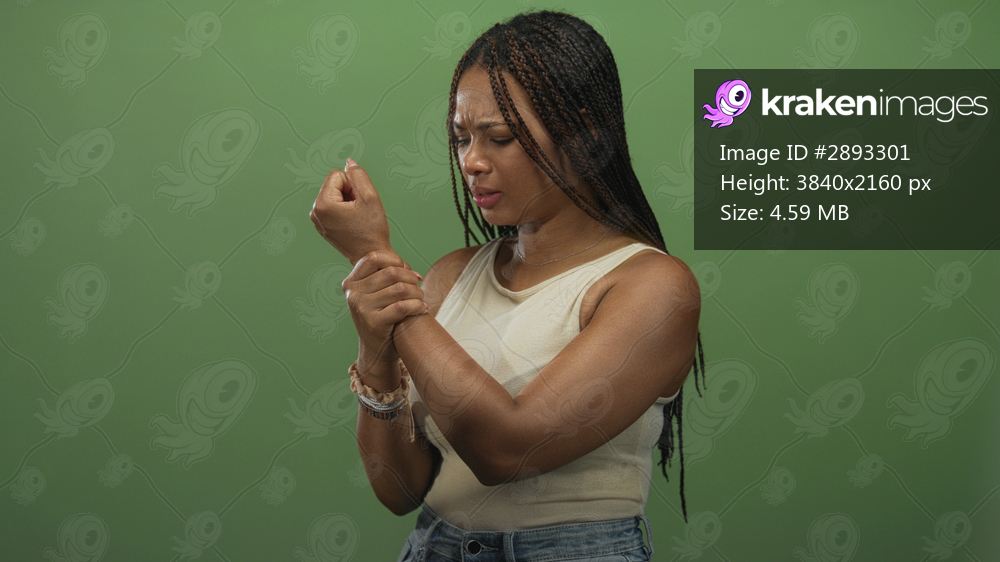 Woman clutching left wrist with tense expression and bracelets, holding wrist for wrist pain in green studio; pain resilience.