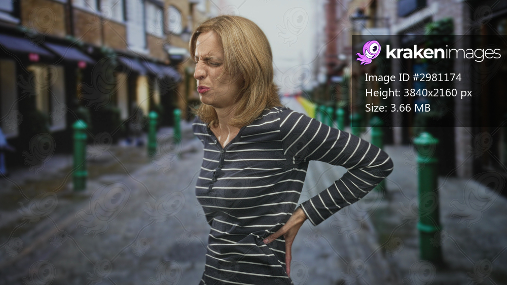 Woman clutching lower back with hand, grimacing and leaning in striped longsleeve sweater on cobblestone street; pain backache struggle.