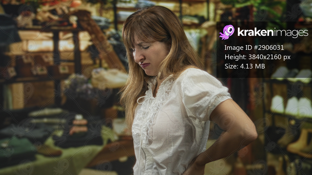 Woman clutching lower back with hand showing backache inside retail shop building; discomfort shopping fatigue.