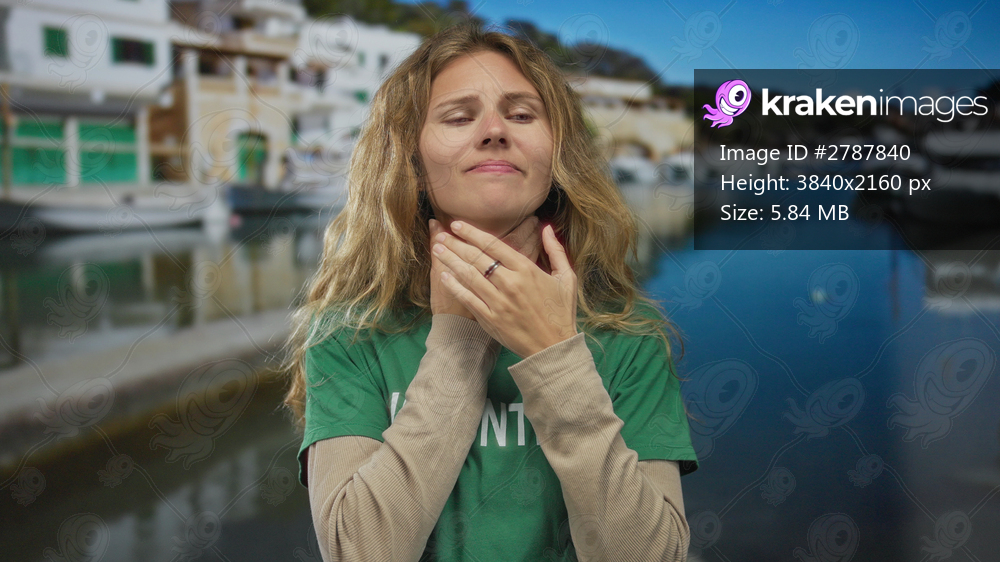 Woman clutching neck by a harbor shows blonde young pain distress in a waterfront outdoor setting.