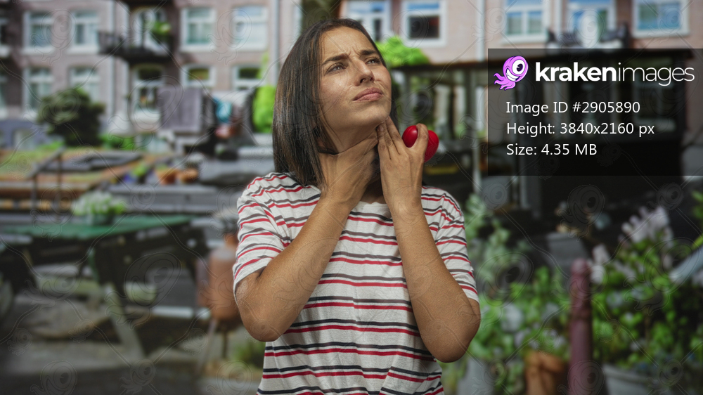 Woman clutching neck and holding red heart on street by canal houses and boats, wearing striped shirt; heartache.