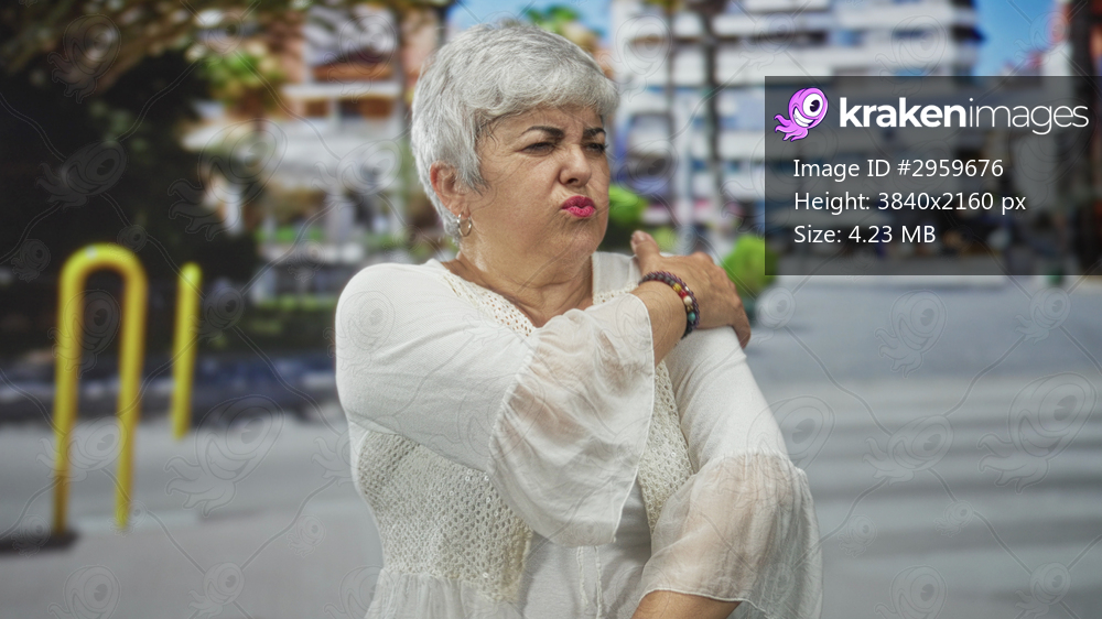 Woman clutching shoulder, wincing and rubbing upper arm on a busy street near cafes and yellow bike racks; pain.