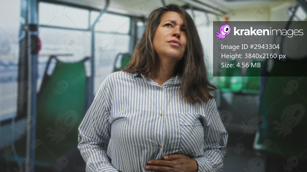 Woman clutching stomach aboard a bus with green seats, grimacing and hunched with hand on abdomen, empty interior on street; pain nausea.