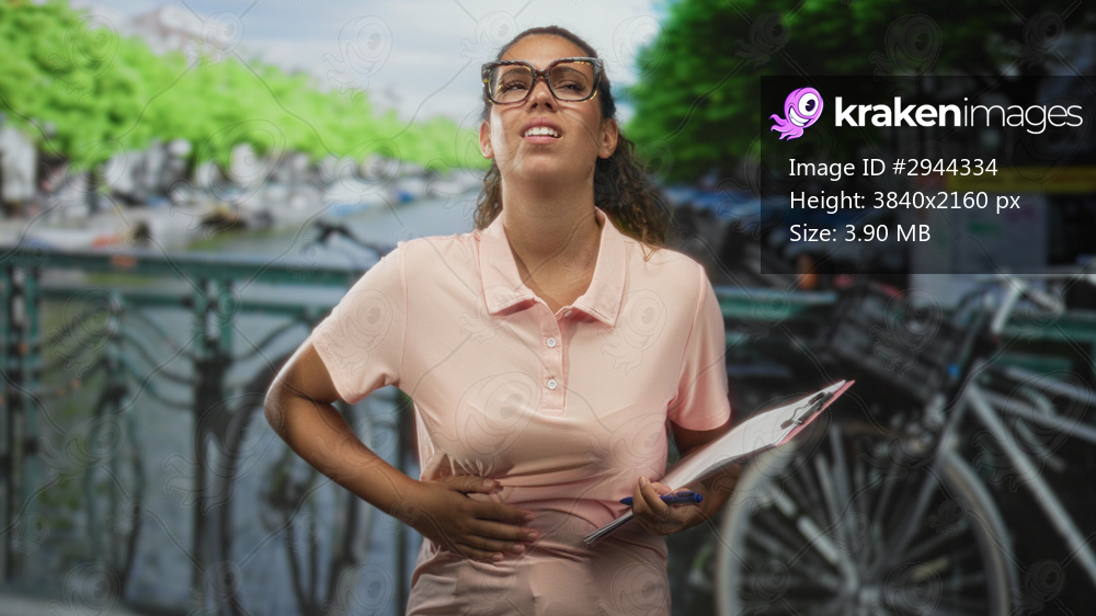 Woman clutching stomach holding clipboard on street wearing glasses and pink polo; discomfort health concern.