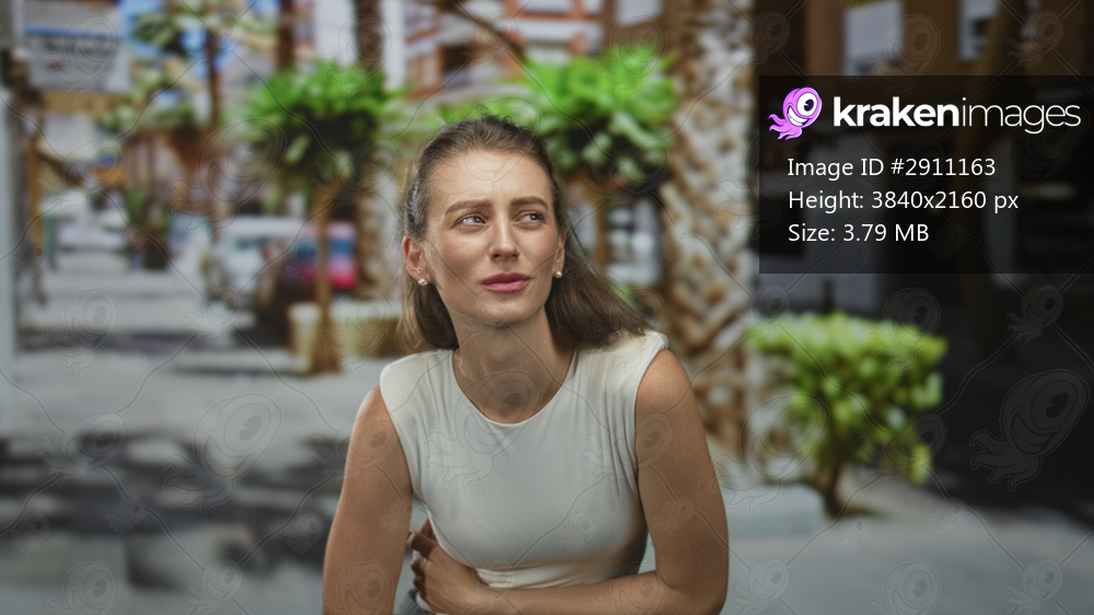 Woman clutching stomach on city street showing abdominal pain for stomachache near palm trees and buildings; nausea discomfort.
