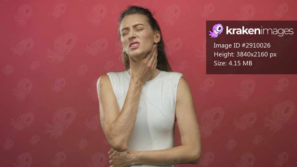 Woman clutching throat and holding neck with one hand in red studio wearing white sleeveless top and closed eyes; pain recovery.