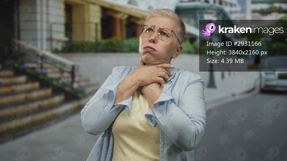 Woman clutching throat on city street with hands around neck and strained expression; panic urgent help.