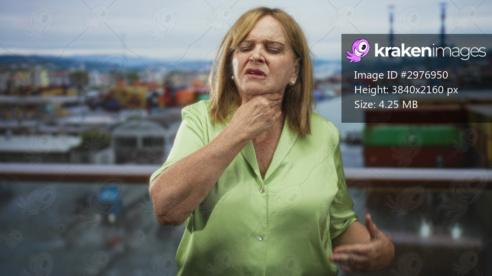 Woman clutching throat with one hand while touching chest beside shipping container on building railing, grimacing from throat pain; health distress.