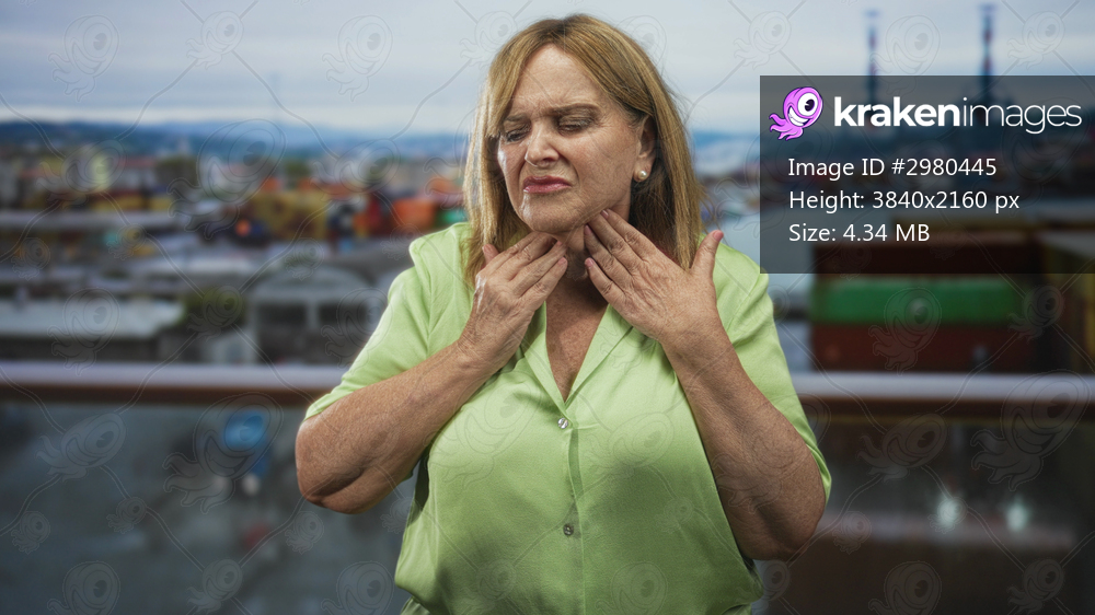 Woman clutching throat with one hand while touching chest beside shipping container on building railing, grimacing from throat pain; health distress.