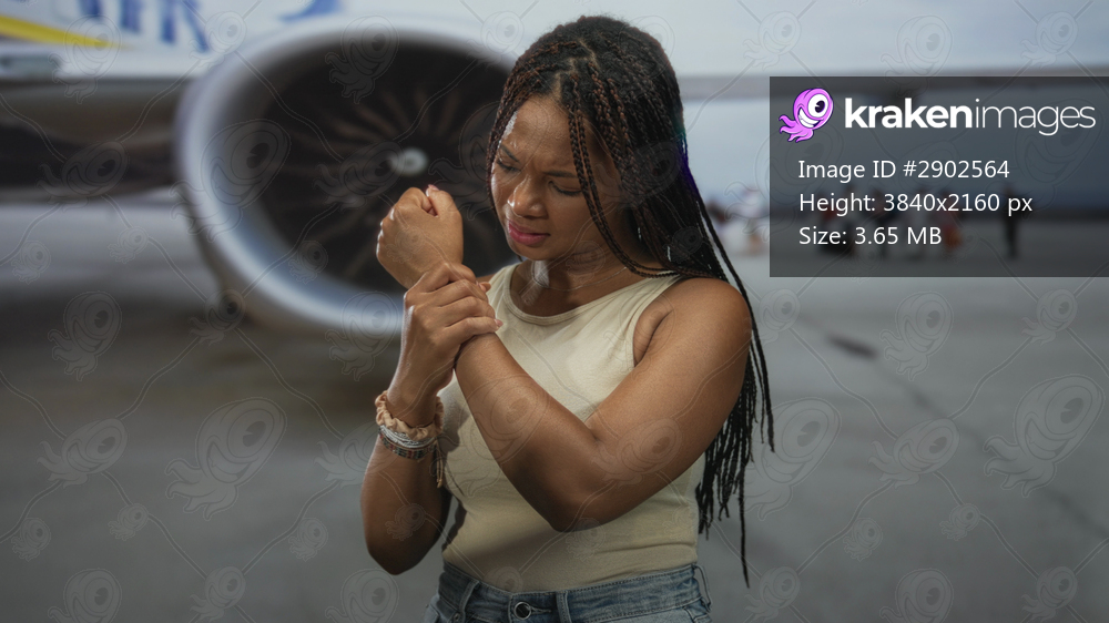 Woman clutching wrist beside a jet engine on airport tarmac near boarding passengers while wincing; travel delay discomfort.