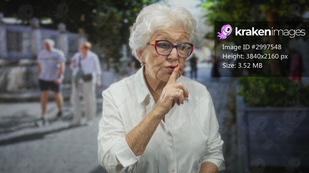 Woman with colorful glasses and white blouse holds finger to lips for silence on a tree lined urban street with blurred pedestrians; secrecy.