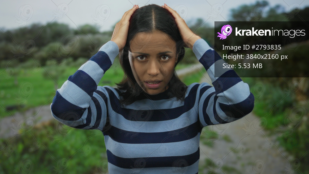 Woman combing hair with hands in a green park setting while wearing a striped sweater, showcasing hispanic beauty and youthful style against a natural outdoor backdrop. - Kraken Images