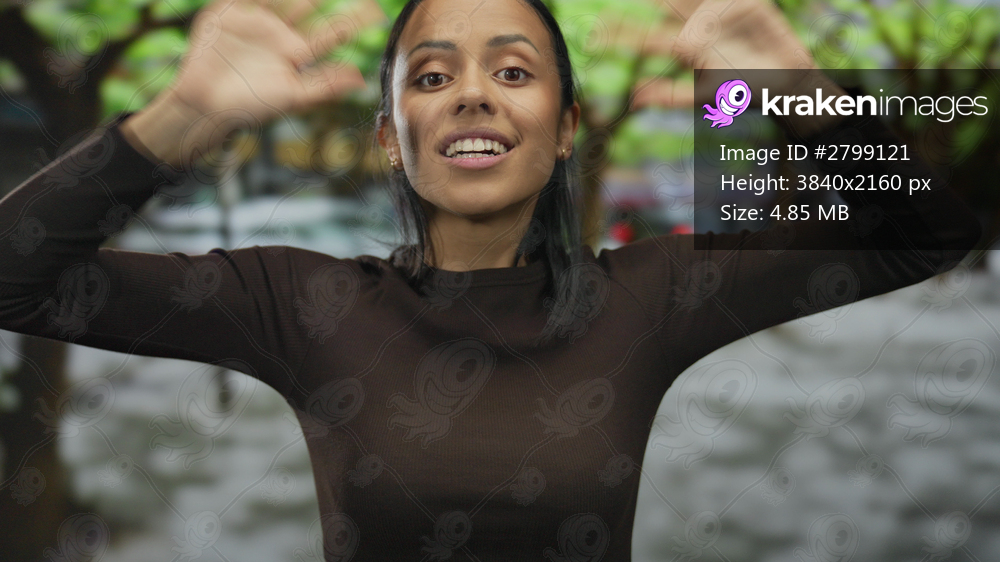 Woman communicating energetically on a lively urban street, showcasing vibrant expressions and hand gestures amidst a backdrop of greenery.