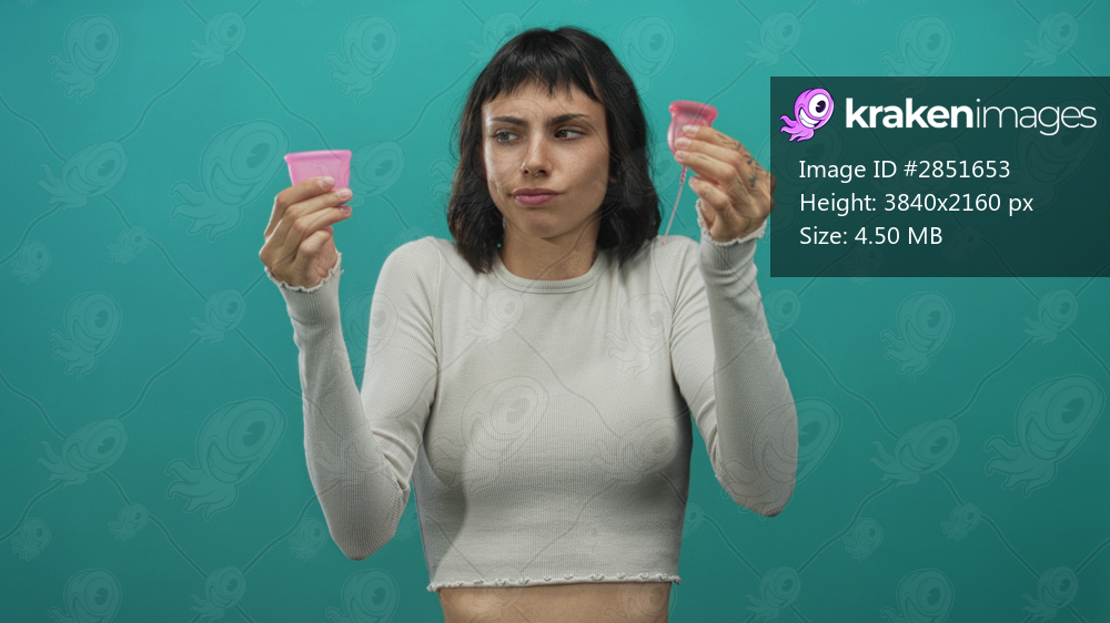 Woman compares two pink menstrual cups with bare hands in studio; contemplation sustainability.