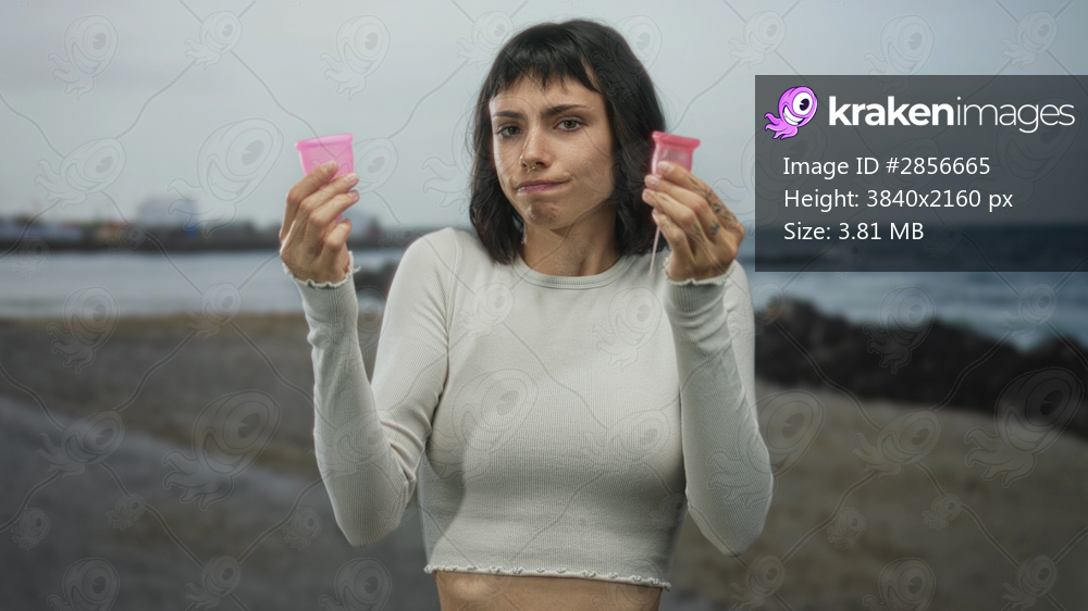 Woman comparing two pink menstrual cups by holding each in her hands on sandy beach shore near ocean waves; empowerment.
