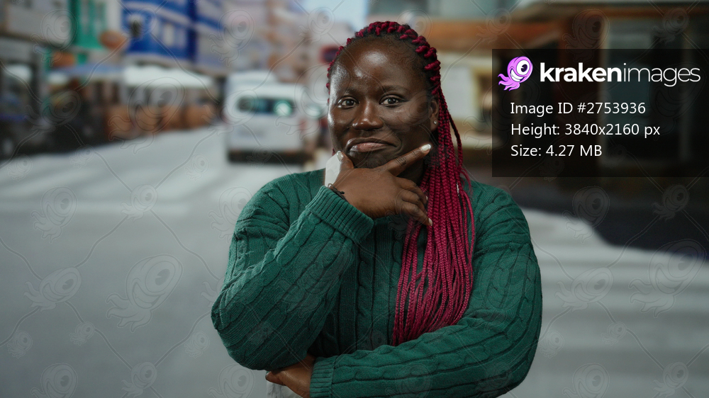 Woman confidently smiling on busy city street wearing green sweater and pink braids surrounded by urban life and vehicles conveying confidence and urban energy outdoors. - Kraken Images
