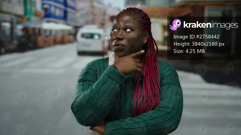 Woman confidently smiling on busy city street wearing green sweater and pink braids surrounded by urban life and vehicles conveying confidence and urban energy outdoors. - Kraken Images