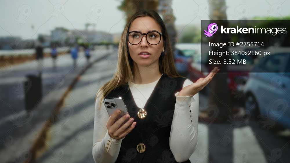Woman confused holding smartphone on busy street intersection with cars and palm trees, wearing glasses, looking frustrated and curious.