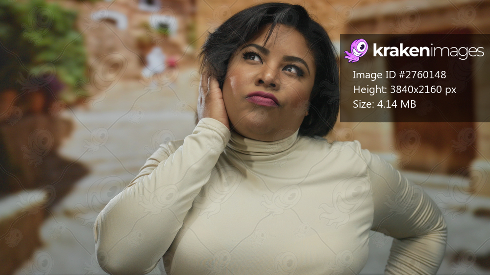 Woman contemplating cityscape with thoughtful expression on vibrant city street in warm outdoor setting wearing casual clothing during daytime.