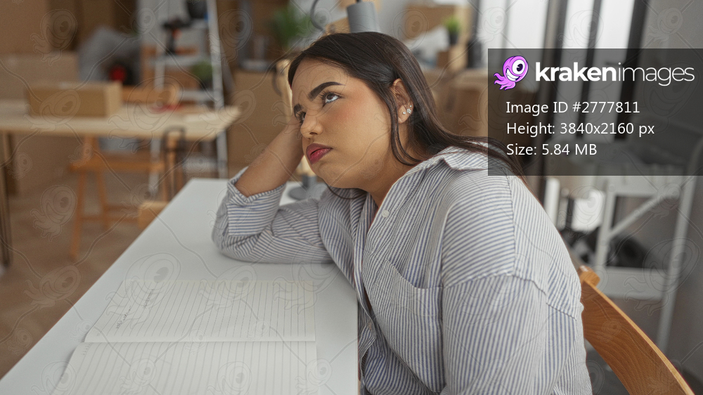 Woman contemplating unpacked boxes and notebook in bright living room of new apartment suggesting a moment of reflection.