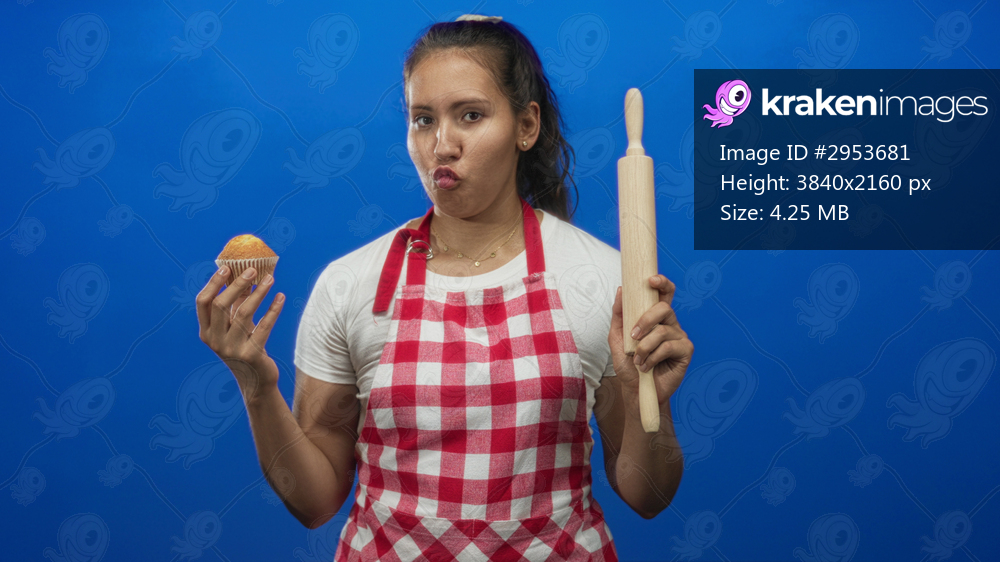 Woman cook holding muffin and wooden rolling pin, puckering lips in studio wearing red check apron; playful baking.