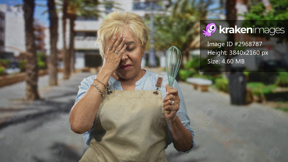 Woman cook holding whisk, hand pressed to forehead in street with apron visible and jewelry on wrist; fatigue kitchen mishap.