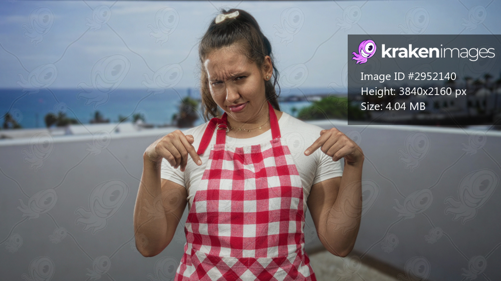 Woman cook in red checkered apron points fingers to apron with grimacing face on rooftop building by the sea; annoyance kitchen mistake.