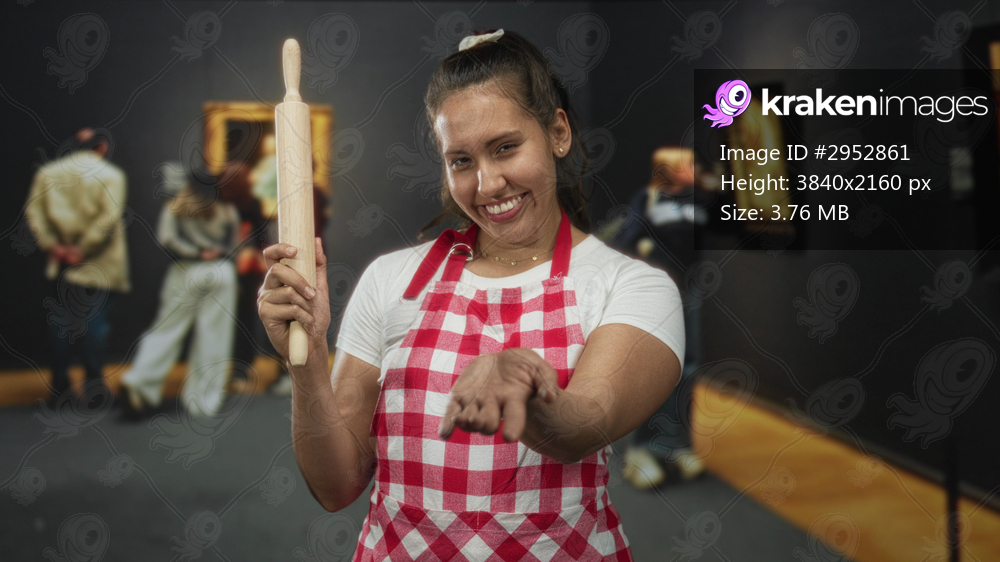 Woman cook smiling while holding a rolling pin and presenting an open hand in an art gallery exhibition; playful hospitality.